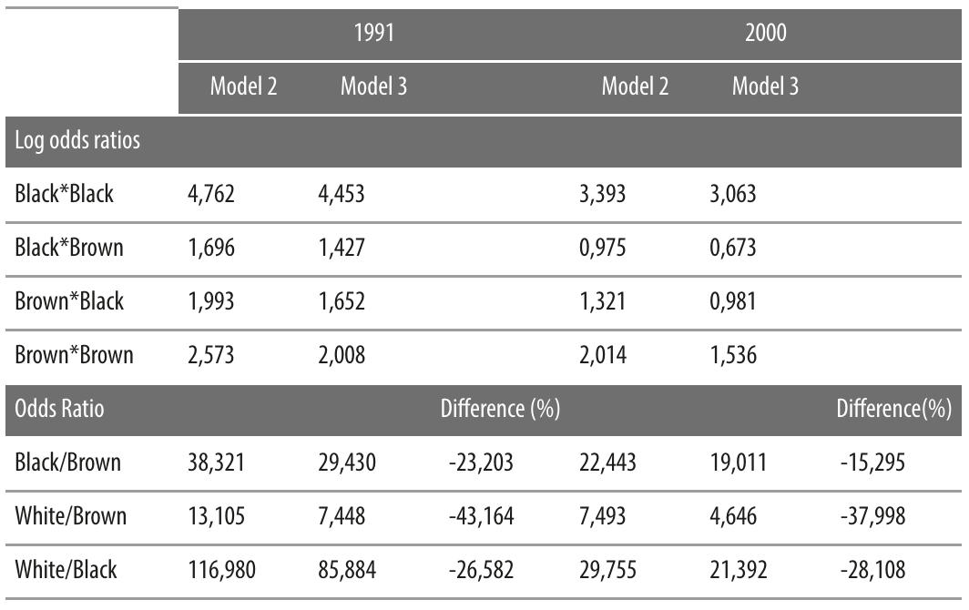 Source: Census 1991 and 2000In table 5, I present the coefficients (log odds ratios) for models 2 and 3 for both periods. The coefficients are the increase in the log of the predicted frequency, taking, for example, the result for black/black couples of model 2 in 2000, 3.393 it means that a black/black couple about 3.4 times more likely to happen than a white/white couple (reference). The odds ratio. representing the homogamy-heterogamy rates, at the bottom of the table for each year, indicate whether a union between two racial groups, black and brown for instance, is more likely to be homogamous, meaning between black and black or brown and brown, or heterogamous. I also included the difference in the odds ratio for models 2 and 3 in order to better understand how the inclusion of the interaction terms changes the interpretation of the homogamy-heterogamy rates.
