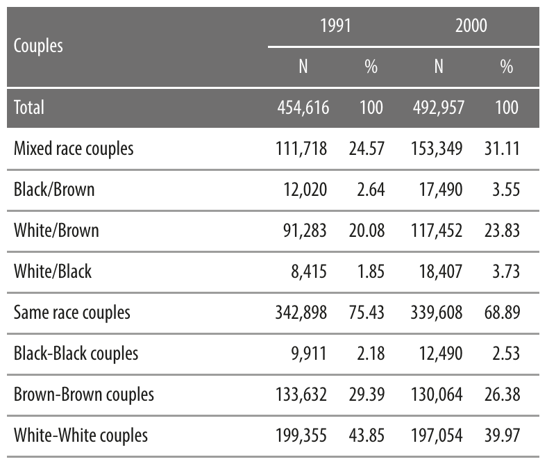 The final sample represents 454,616 couples, in which both spouses were between 20 and 34 years of age in 1991, and 492,957 couples, who were also between this same age range, in 2000. Most of these couples were in racially endogamous unions: 75.43 percent in 1991 and 68.89 percent in 2000. White-white couples made-up the majority of these unions, representing 43.85 percent of all couples in 1991 and 39.97 percent of all couples in 2000. Among interracial couples, the white/brown union represented the majority (Table 1).