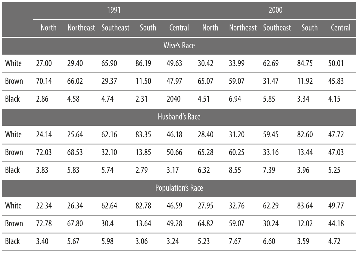 An important regional difference3 emerges in terms of racial distribution. Table 2 shows that in the South a little more than 80 percent of the population was white in 1991 and in 2000, whereas in the North, where there are fewer whites, about 70 percent were brown in 1991 and 64.82 percent were brown in 2000. The region with a more balanced distribution between whites and nonwhites is the Central area of Brazil. There are a few more white wives than white husbands, which points to a gender asymmetry in terms of more white women marrying nonwhite spouses than white men.