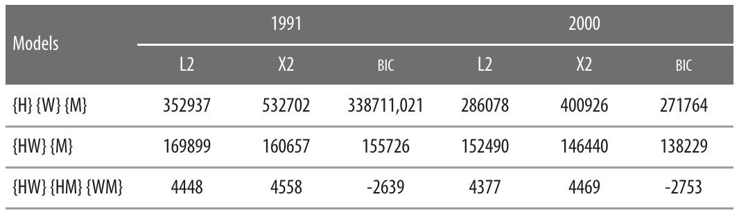 Table 4 shows the adjustment measures for the three models in order to analyze which one better adjusts to the data. The main conclusion is that the third model (that includes two interaction terms: one between a wife’s race and mesoregion, and the other between a husband’s race and mesoregion) has a better fit in both 1991 and 2000. This result indicates that a spouse’s race and the local marriage market are associated, which reassures the importance of considering the local marriage market racial distribution when analyzing the partner choice process. Considering the difference in the degrees of freedom (1088-544=544) and the critical chi-squared test (599.37 for alpha=0.05) the L2 and the X2 are statistically significant. This means that the third model is more effective than the second model. Moreover, the bic is negative for the third equation. As a result of the fact that the coefficients of model three are significant and statistically different from the second model,4 the statement can be made that local racial characteristics influence the level of intermarriage. This information indicates that the assumption that there is only one national marriage market, which is made in equation 2, is not correct, but I will present the results of both models (2 and 3) for comparison.