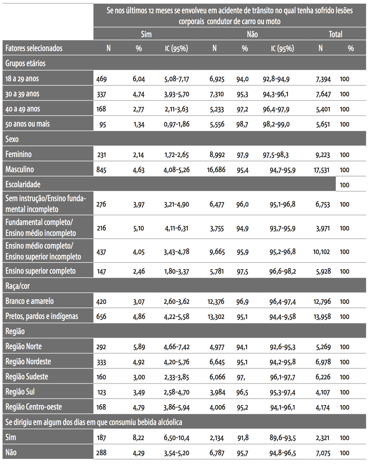 Os resultados da análise descritiva se encontram na Tabela 1. Conforme é possível observar, do total de condutores de carro ou moto com idade entre 18 e 29 anos, cerca de 6% declararam envolvimento em acidente de trânsito no qual tenham sofrido lesões corporais nos últimos 12 meses. Esse percentual diminui à medida que se avança nos grupos etários mais elevados, sendo de apenas 1,34% no grupo etário 50 anos ou mais.