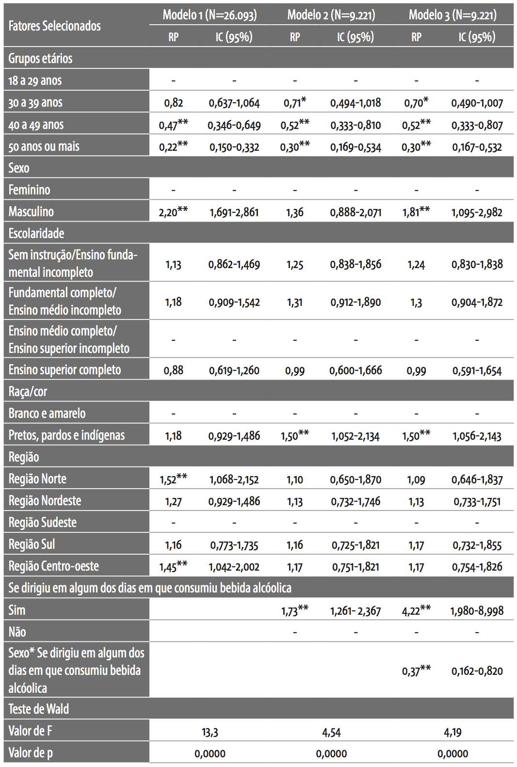 No modelo 2, com a inclusão da variável comportamental se o respondente dirigiu em algum dos dias em que consumiu bebida alcóolica, algumas variáveis ganharam significância estatística, outras tiveram seus efeitos potencializados ou até mesmo perderam associação com a variável dependente. No caso dos grupos etários, a categoria 30 a 39 anos (RP=0,71; p<0,10) alcançou significância estatística e os demais grupos etários mantiveram a associação apresentada no modelo 1, porém, com magnitude ainda maior (Tabela 2).
