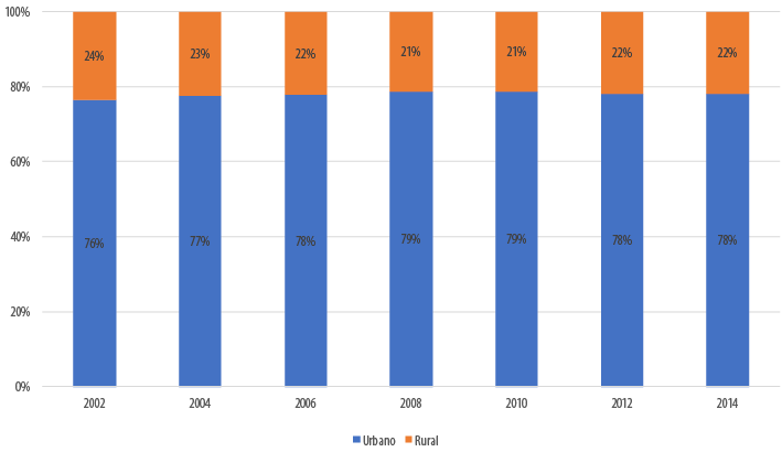 En términos relativos, los hogares rurales del país han descendido, tendencia que se ha observado desde las últimas décadas del siglo pasado. Es así como, para el año 2014, el 22% de los hogares del país se ubicaba en localidades no urbanas, con una disminución de 1,5% en relación con el año 2002 (Gráfico 1). Por otro lado, en 2002 existían en las zonas rurales alrededor de 5,8 millones de hogares, que para 2014 ascendieron a siete millones. Es de resaltar que la importancia de las actividades agrícolas es menor en la medida en que la población se localiza en contextos más urbanizados, en las localidades con más de quince mil habitantes los hogares agropecuarios representan tan solo el 4%.