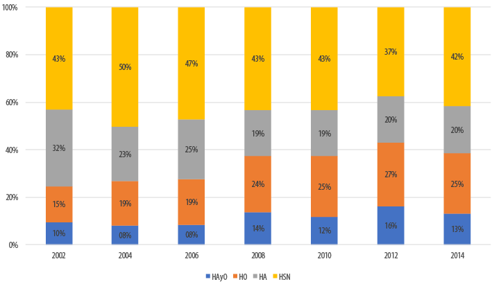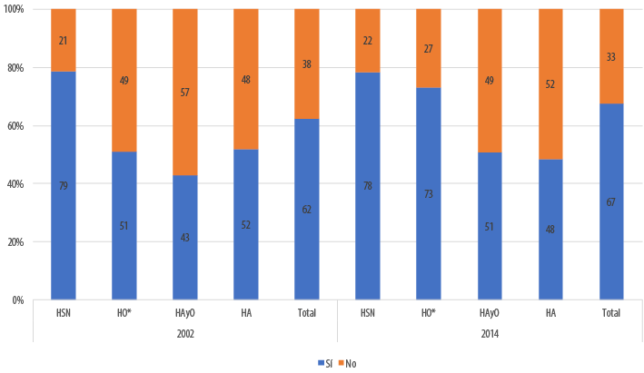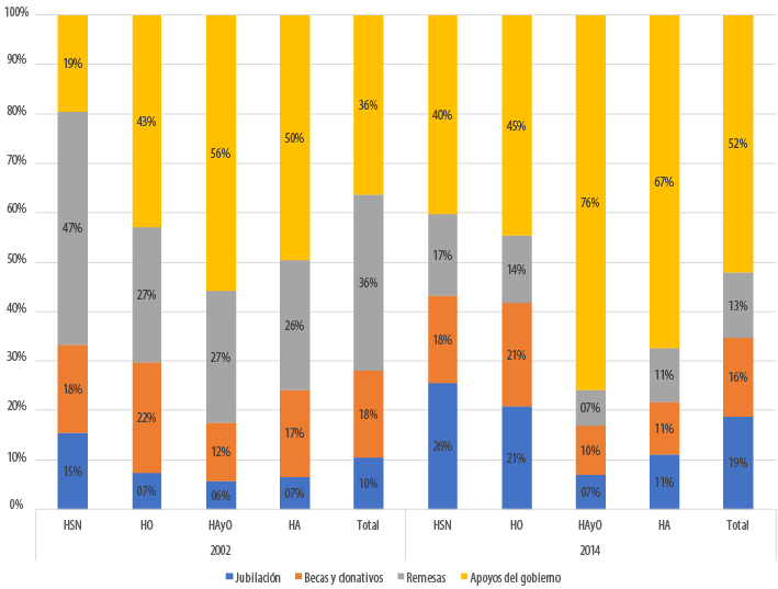 El porcentaje del ingreso por transferencia debido a becas y donativos se mantuvo prácticamente igual entre los hsn y ho entre 2002 y 2014. Para el resto de los hogares analizados su participación disminuyó entre 6% (para los ha) y 2% (hayo) (Gráfico 6).