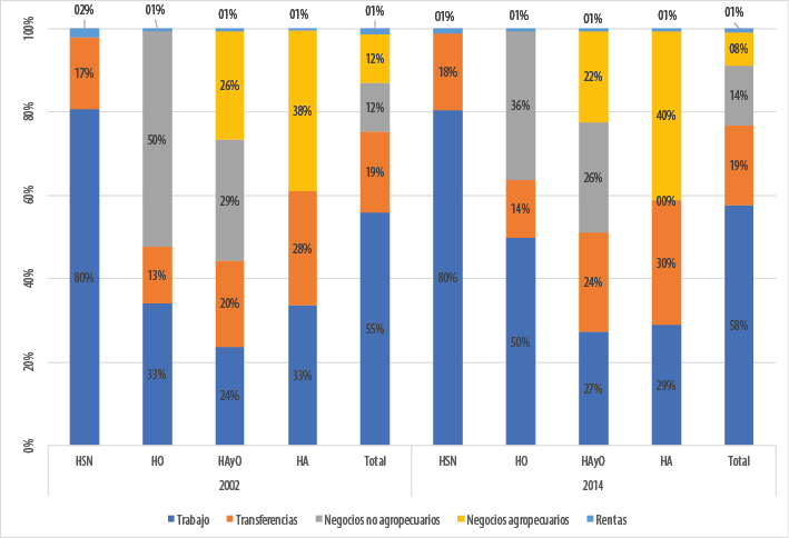 Esta tendencia difiere según el tipo de hogar: el ingreso de los hsn proviene mayoritariamente del trabajo para el mercado (80,4% en 2014) y le siguen en importancia las transferencias (18,3%). Para los ha esta distribución cambia significativamente, ya que si bien dichos hogares dependen de los ingresos por trabajo13 (28,6%), los negocios agropecuarios aportan cerca de 40% y las transferencias representan cerca de una tercera parte del ingreso (29,5%), aspecto que nos habla de la diversidad en la fuente de ingresos de este tipo de hogar, al parecer una estrategia para lograr cubrir sus necesidades básicas. En los hogares que combinan negocios agropecuarios con otro tipo de negocios, es decir, los hayo, los ingresos por negocios (48%) superan a los ingresos por trabajo (29%). Cabe mencionar que esta estructura de distribución no presenta grandes cambios entre 2002 y 2014 (Gráfico 3).