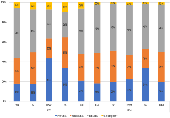 Otra forma de señalar el fenómeno de la multiactividad en los hogares rurales del país es a través del rastreo de la procedencia de los ingresos por trabajo según el sector de actividad económica. Así, un primer hallazgo es la pérdida de la centralidad de los ingresos por trabajo agrícola: en 2002 uno de cada tres pesos provenía del trabajo en las actividades primarias, mientras que para 2014 esa relación disminuyó al 20%. Es de resaltar el incremento de la terciarización en las zonas rurales del país: cerca del 50% de los ingresos laborales provienen de estas actividades. En los ha y hayo se observa una fuerte relación entre la obtención de ingresos por negocios agropecuarios e ingresos por trabajo provenientes de las actividades primarias: en la medida en que un hogar no dependa de los ingresos por negocios agropecuarios disminuye el peso del ingreso por trabajo agropecuario y gana importancia el ingreso por trabajo proveniente del sector secundario y terciario de la economía (Gráfico 5).