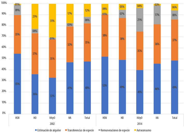 De manera generalizada es aceptado que la descripción del gasto de los hogares brinda elementos para conocer las condiciones de vida de los hogares y sus integrantes. En el Gráfico 7 se representa la aproximación empírica más inmediata de las estrategias implementadas por hogares rurales para satisfacer sus necesidades básicas. Por ejemplo, la disminución del peso de las remesas entre 2002 y 2014 posiblemente sea reflejo del incremento en 2,7% de las transferencias, especialmente en los hsn —los mismos que sufrieron una reducción más drástica en las remesas—. El aumento de las remuneraciones en especie en 2,3% con un mayor peso en los ha y los hayo se corresponde con la disminución del autoconsumo. Por otra parte, la relevancia que adquiere el valor del alquiler habla de la tendencia de los hogares asegurar su reproducción material a través de su gasto en el componente más fungible y el más duradero al mismo tiempo (Gráfico 7).