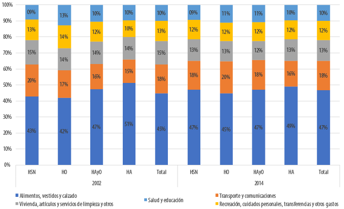 Para los dos años analizados se observa que los hogares rurales destinan la mayor parte de su ingreso monetario al gasto en alimentación, vestido y calzado, puesto que de cada $ 100 gastados aproximadamente $ 50 son para cubrir este tipo de bienes. Sin embargo, solo se observa un incremento en el porcentaje del gasto en estos rubros, entre los hsn (4,2%) y entre los ho (2,9%) (Gráfico 8). Aun con este incremento, se puede observar que prácticamente no hay cambios en el patrón de gasto de los hogares rurales, lo cual muy posiblemente sea reflejo del nulo incremento en sus ingresos (Taylor y Mora, 2015).