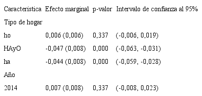 Cuando se observan las interacciones entre tipo de hogar y año, se observa que solo son significativas para los hogares tipo ho en 2014, con signo negativo, mientras que en los otros tipos de hogar no fue así (Tabla 5).
