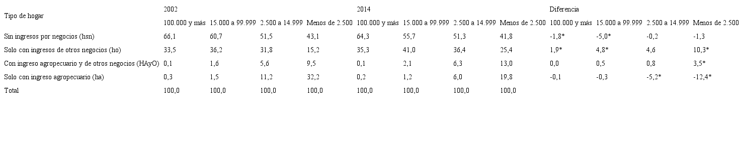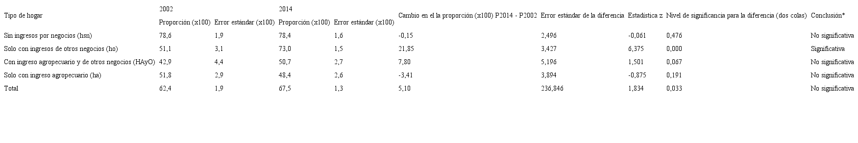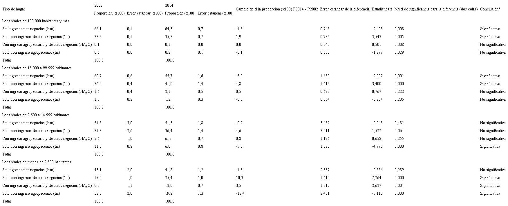 También se hicieron dos tipos de pruebas de hipótesis de comparación de proporciones. Con la primera se contrastó si el porcentaje de hogares según tipo por tamaño de localidad son estadísticamente diferentes entre 2002 y 2014; la segunda permitió verificar si la proporción de hogares rurales que recibe ingreso por trabajo es estadísticamente diferente entre los dos analizados, de manera que las hipótesis estadísticas planteadas fueron: