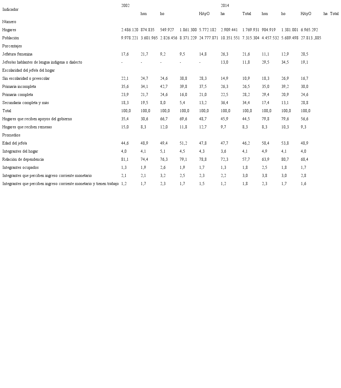 El análisis del ingreso y del gasto se complementó con una descripción de algunas de las características e indicadores sociodemográficos que consideramos más relevantes de los hogares para los dos años analizados, los cuales fueron: sexo, condición de habla de lengua indígena y escolaridad del jefe del hogar;11 número de integrantes; número de integrantes ocupados; integrantes que perciben ingreso corriente monetario; integrantes que perciben ingreso corriente monetario y tienen trabajo; la relación de dependencia.