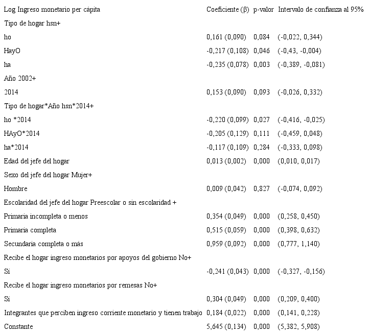 Aun cuando el objetivo del estudio que se planteó fue de carácter descriptivo se hizo un modelo de regresión lineal múltiple (mrlm), donde la variable dependiente fue el logaritmo natural del ingreso per cápita12 de los hogares analizados y las variables independientes, las características sociodemográficas del jefe/a del hogar, los años analizados y el tipo de hogar. Los resultados del mrlm permitieron observar si el ingreso monetario per cápita de los hogares rurales cambió entre 2002 y 2014, controlando por las características sociodemográficas y por el tipo de ingresos por negocios que recibe.
