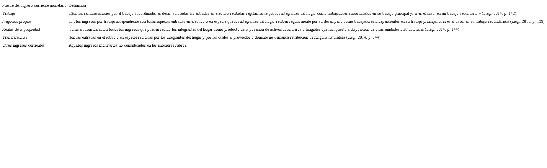 El ingreso corriente monetario,6 el cual quedó conformado por los ingresos correspondientes al trabajo, a los negocios propios agropecuarios y no agropecuarios, a las rentas de la propiedad, a las transferencias y a otros ingresos corrientes (Cuadro 1).7