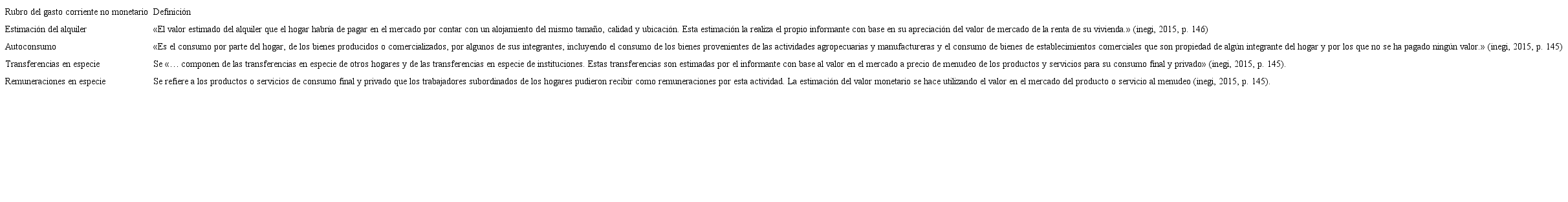 El gasto corriente no monetario está integrado por la estimación del alquiler, el autoconsumo, las transferencias en especie y las remuneraciones en especie (Cuadro 3).
