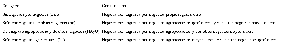 Con base en el ingreso por negocios agropecuarios captado de las enigh de 2002 y de 2014, a estos hogares se los clasificó en alguna de las siguientes categorías: 1) hogares que solo reciben ingresos de negocios agropecuarios (ha); 2) hogares con ingresos de negocios agropecuarios y otros negocios (hayo); 3) hogares que no reciben ingresos por negocios agropecuarios, pero sí de otros negocios (ho), y 4) hogares sin ingresos por negocios (hsn) (Cuadro 4). A esta variable se la denominó tipo de hogar.