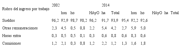 Con el interés de conocer con profundidad cómo se distribuyen los ingresos del trabajo remunerado, se observa que los sueldos tienen un mayor peso (Tabla 3) en 2002. Sin embargo, doce años después, disminuye en al menos cuatro puntos porcentuales su importancia y asoman actividades de carácter secundario, que no corresponden al trabajo principal. Conforme el hogar rural es más agrícola se diversifican las fuentes de ingresos por trabajo (6% en los hogares ha), recurriendo a la multiactividad como estrategia para la consecución de mejores ingresos. El poco dinamismo de los otros rubros permite conjeturar sobre la necesidad de los hogares de complementar el ingreso proveniente de la actividad principal ante la pérdida de seguridad y estabilidad que proveen los salarios.