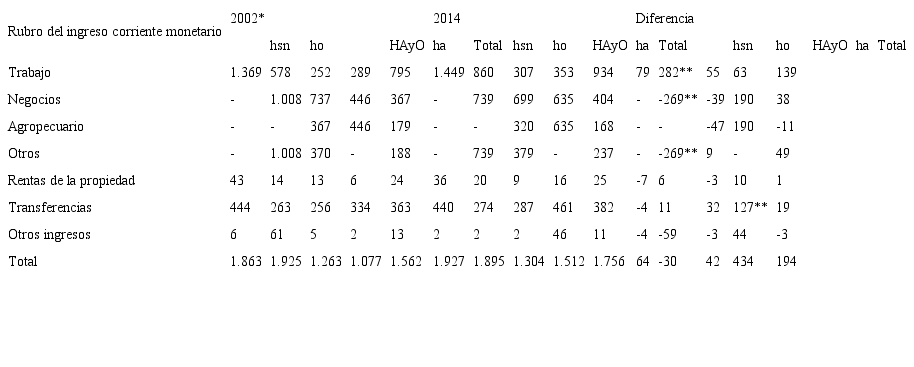 Con relación al nivel de ingresos, entre 2002 y 2014 se presenta una pérdida real del poder adquisitivo de los hogares rurales y los incrementos observados no son estadísticamente significativos (Tabla A3 del Anexo), evidencia que se presenta también en los hsn (que representan 50% de los hogares rurales). Además, cabe mencionar que los hogares que perciben ingresos por actividades derivadas del sector agropecuario (ha y hayo) obtienen, en promedio, un ingreso menor que los hogares no agrícolas, lo que habla de su mayor vulnerabilidad y de la precariedad en sus condiciones de vida, ya que no logran cubrir la canasta básica con el ingreso que obtienen (Tabla 4).