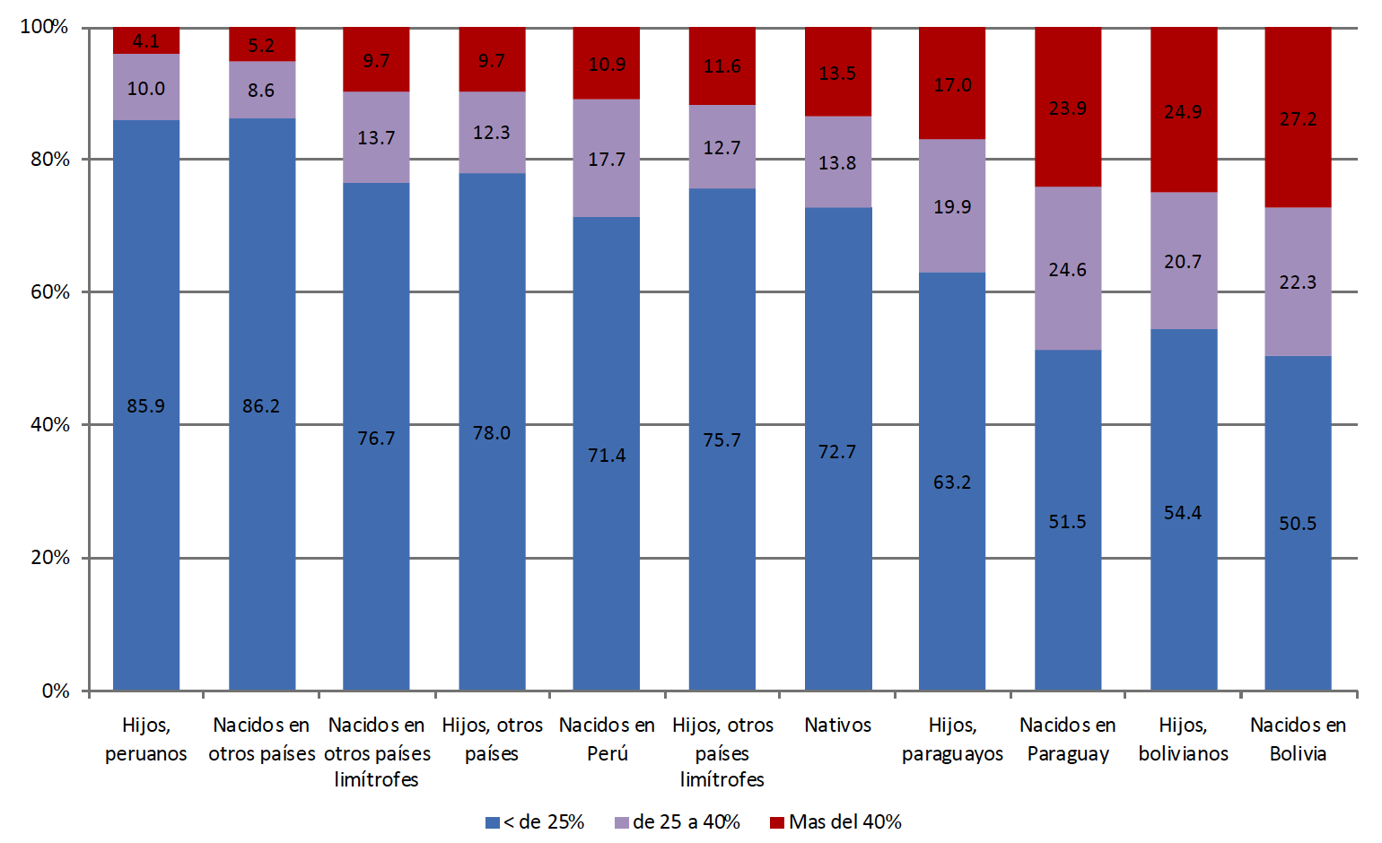 Los estudiantes de origen boliviano y paraguayo no solo se concentran en mayor medida en escuelas de gestión pública con poblaciones más desfavorecidas económicamente, sino que en ellas la presencia de extranjeros es considerablemente más elevada (Gráfico 3). Cuatro de cada diez nacidos en Bolivia asisten a escuelas en las que al menos el 40% de sus compañeros y compañeras de año son extranjeros. Solo entre los hijos de bolivianos y los nacidos en Perú, este porcentaje es algo más reducido, pero continúa siendo elevado (cercano al 30%).