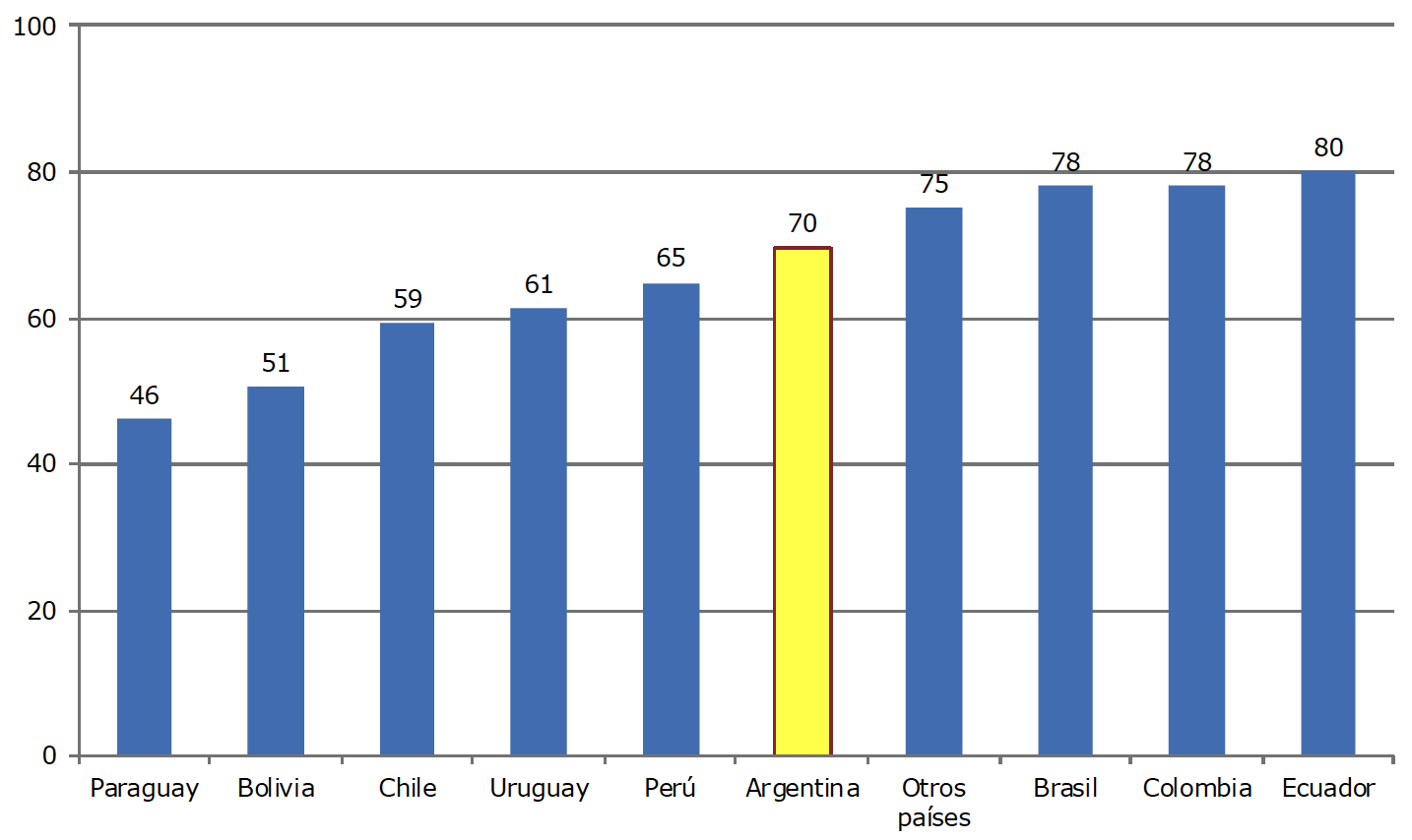 Fuente: elaboración propia a partir de Redatam, Censo Nacional de Población y Vivienda, 2010En suma, en términos normativos, la Argentina garantiza a los inmigrantes el acceso a la educación pública gratuita en todos los niveles educativos y sin embargo no todos los inmigrantes tienen las mismas posibilidades para permanecer y avanzar dentro del sistema. Vale entonces preguntarse en qué medida la condición migratoria influye en los aprendizajes de los estudiantes.