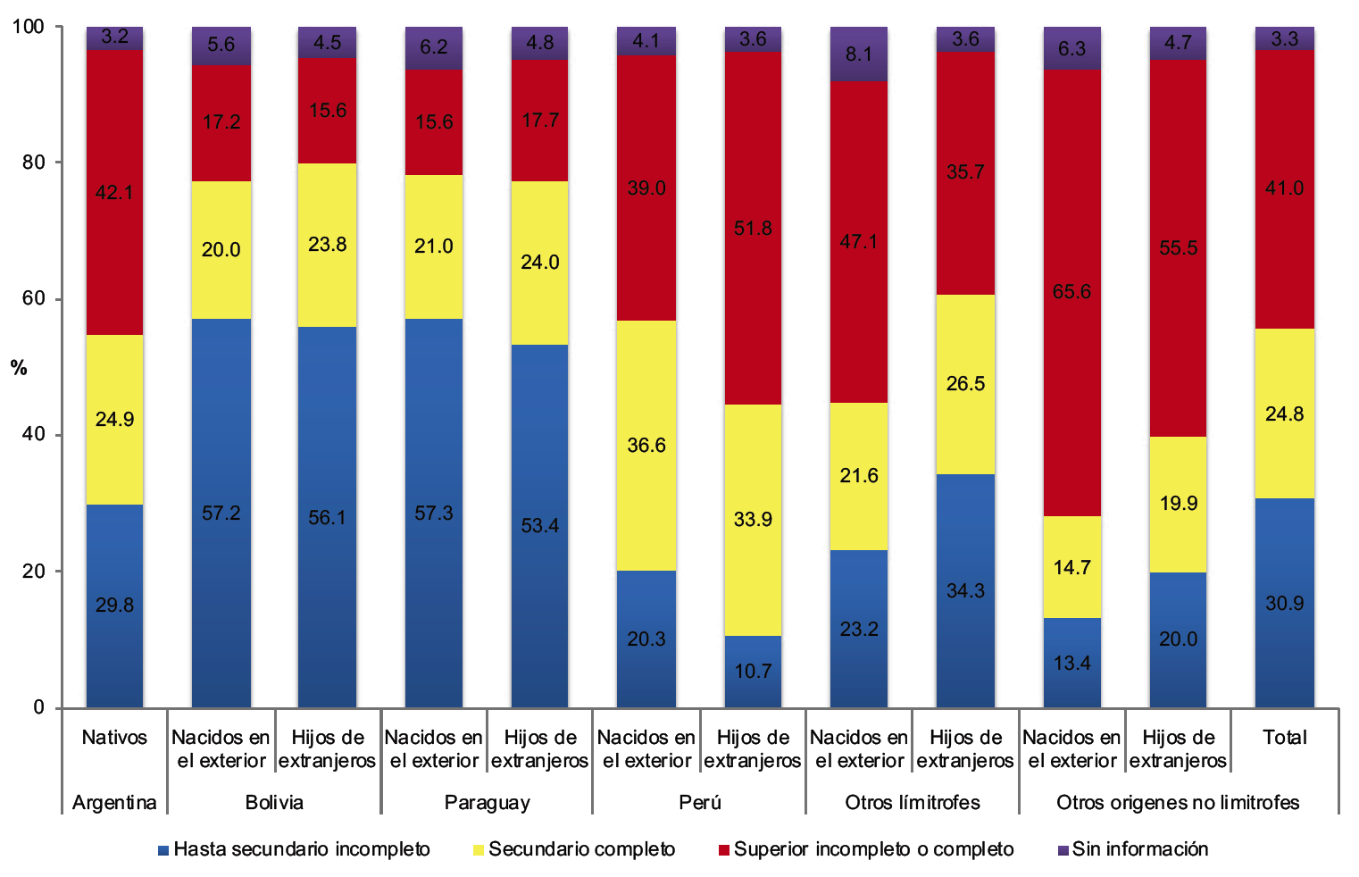 La integración social y económica de todos estos grupos es heterogénea. En primer lugar, se distinguen por el tiempo que llevan residiendo en el país: algunos colectivos arribaron hace décadas, por lo que ya han tenido hijos (y hasta nietos) argentinos, mientras que otros lo hicieron mucho más recientemente. También se distinguen por sus perfiles socioeconómicos, raciales y étnicos. En efecto, algunos colectivos superan con creces los alcances educativos de la población nativa, mientras que otros se encuentran en franca desventaja. Entre los primeros se encuentran los llegados más recientemente, como los venezolanos, colombianos y ecuatorianos, seguidos por los oriundos de Perú y Brasil.9 Entre los segundos, los provenientes de Bolivia, Paraguay y Chile, corrientes inmigratorias tradicionales en la Argentina.