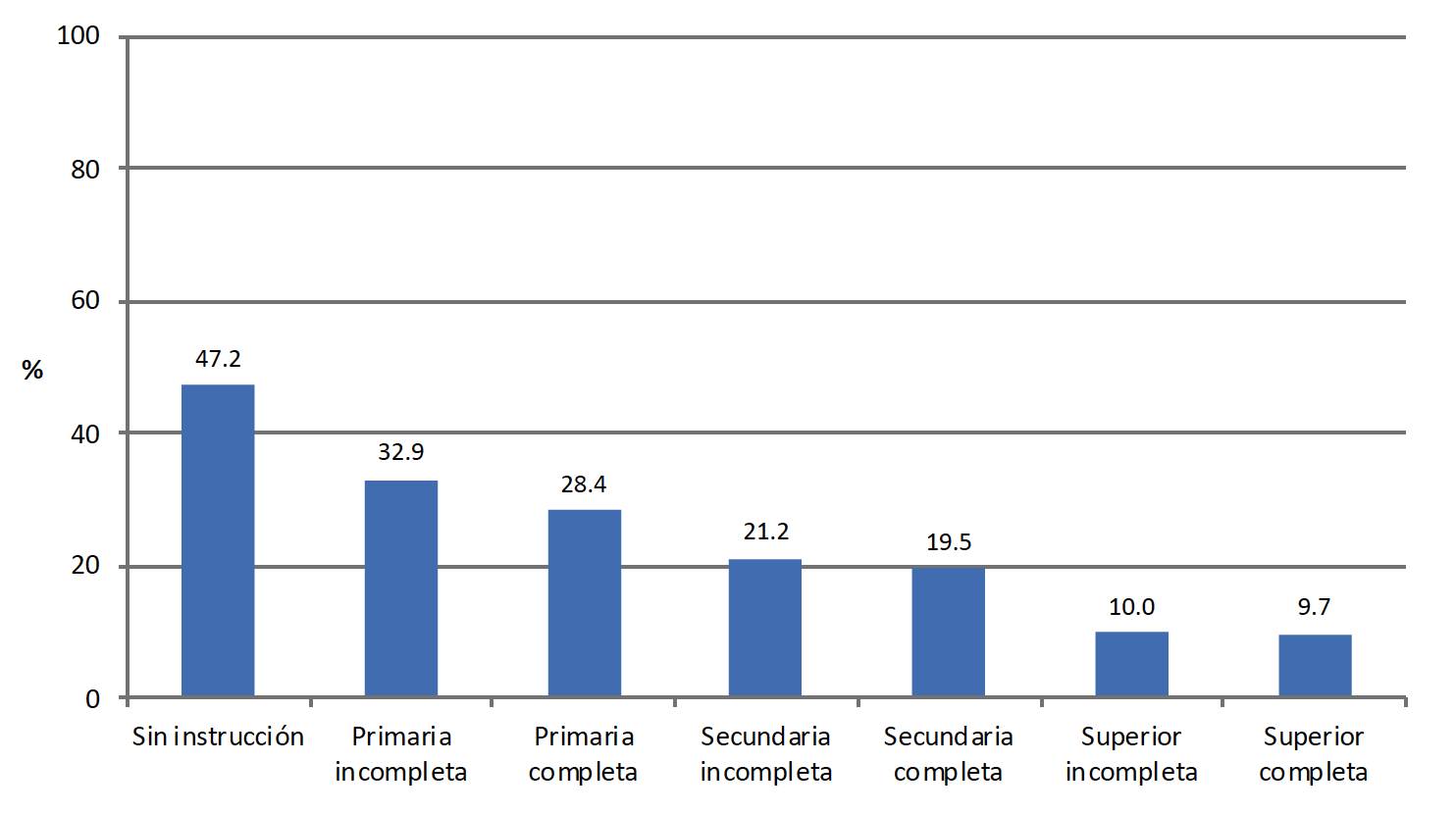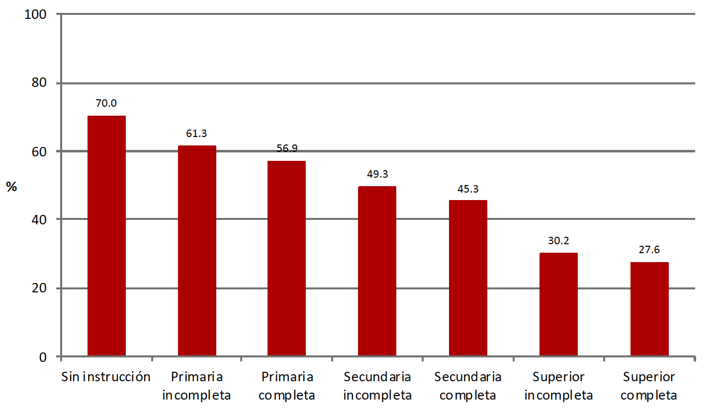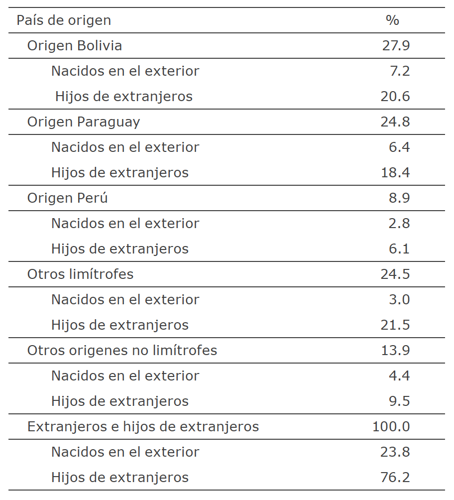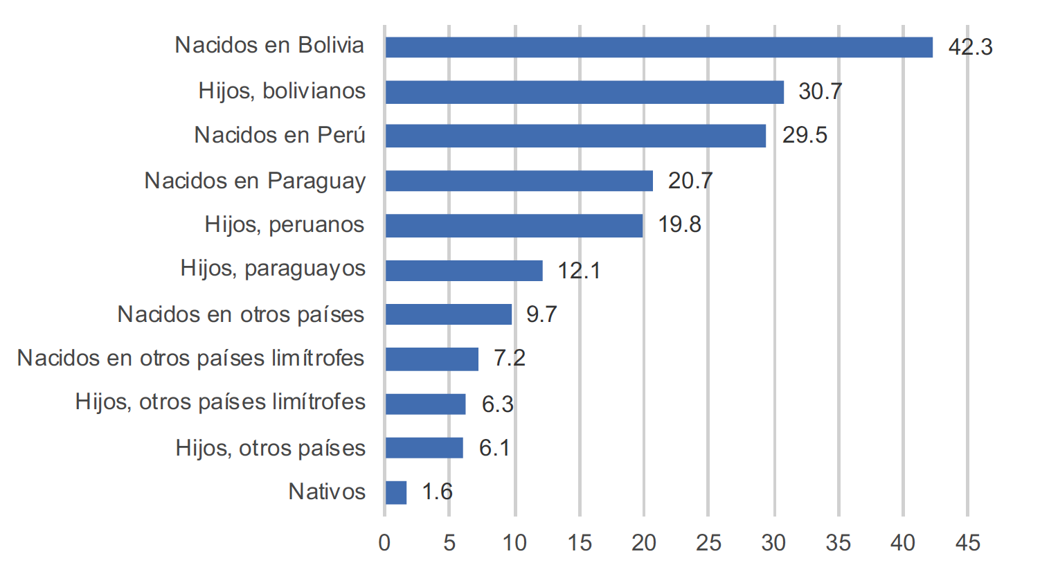 Los inmigrantes se distinguen en cuanto a la incidencia de privaciones materiales esenciales, como las necesidades básicas insatisfechas (NBI). Entre los grupos más numerosos, tanto peruanos como bolivianos exhiben las situaciones de vida más precarias: un 30 y un 27%, respectivamente, viven en hogares que poseen algún indicador de NBI. Otros grupos en situación de mayor vulnerabilidad son los provenientes de República Dominicana (con un 23%) y de Paraguay (20%). Para el resto de los inmigrantes el porcentaje de pobres estructurales es inferior al de los nacidos en la Argentina (16%).