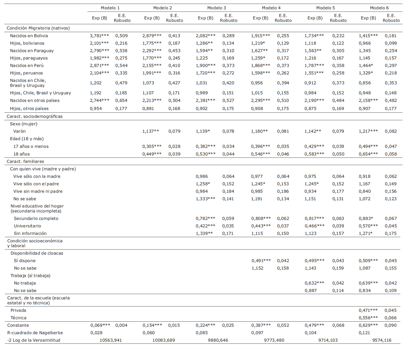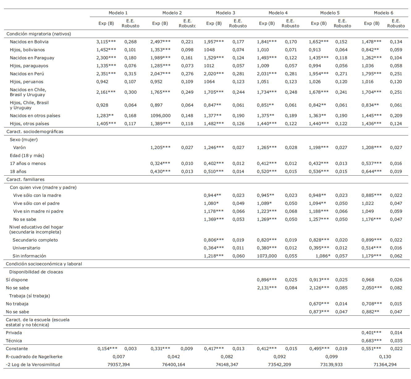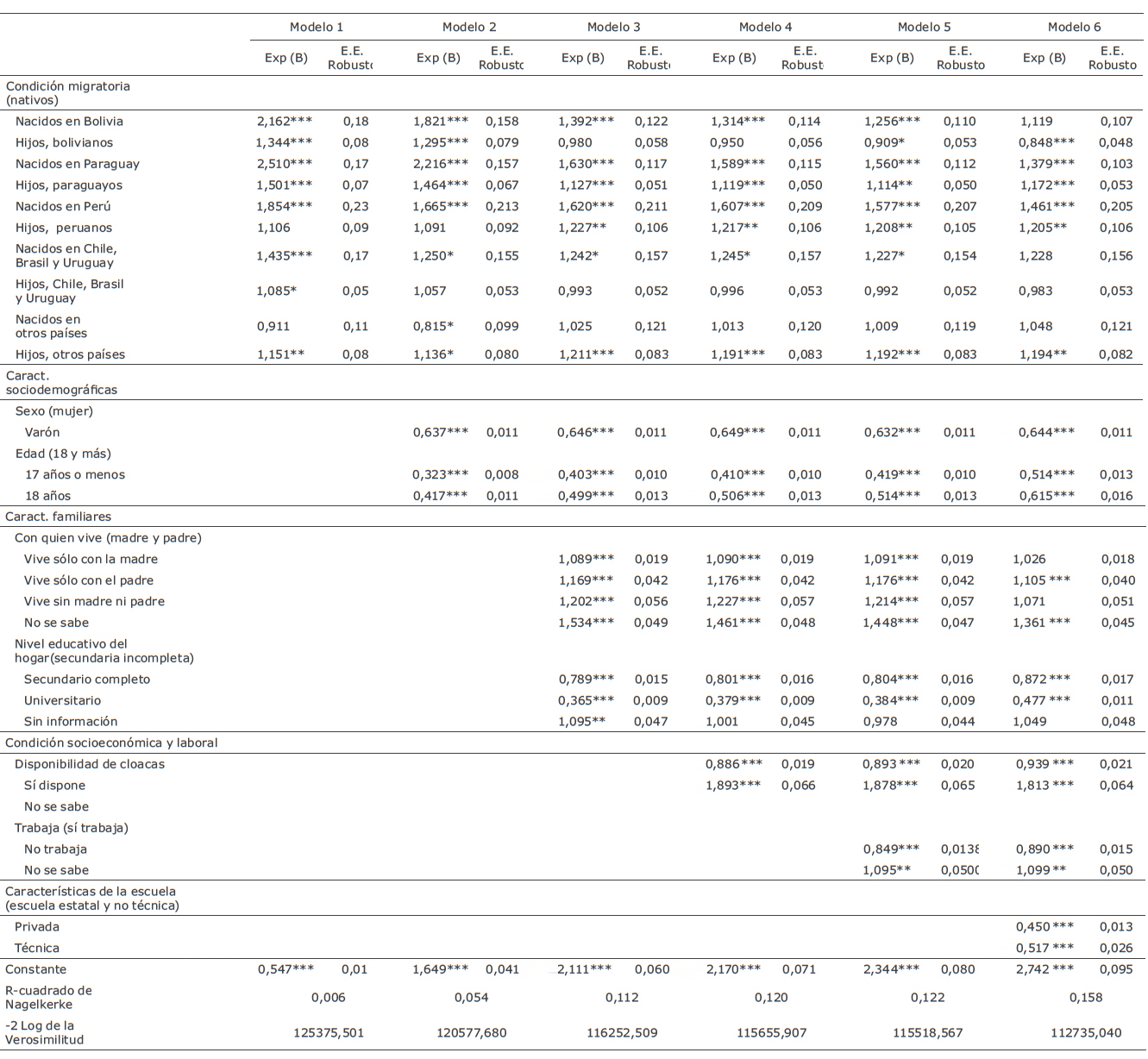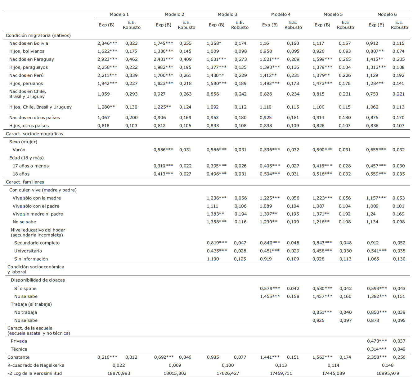 Notas: N= 19.255. ***p < 0.01; **p < 0.05; *p < 0.10En Argentina, el número de adolescentes inmigrantes ha venido incrementándose producto del gran dinamismo de las migraciones regionales hacia este país en años recientes. Si bien la migración es un proceso que abre nuevas oportunidades, constituye también un reto tanto para los migrantes como para las sociedades de acogida, que deben propiciar su adecuada integración. Uno de los mecanismos clave para la integración social de los niños, niñas y adolescentes inmigrantes es el sistema educativo, el cual debe fomentar no solo el avance y la permanencia educativa sino la adquisición de conocimientos significativos. Argentina cuenta con un corpus normativo sólido que confiere a los inmigrantes derechos educativos en un plano de igualdad con la población nativa, aun con independencia de su situación migratoria, lo cual facilita sin duda la inclusión social de niños, niñas y adolescentes inmigrantes.