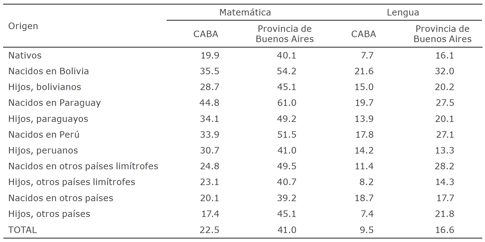Dadas las marcadas diferencias en los niveles de aprendizaje promedio en las distintas jurisdicciones del país, y teniendo en cuenta la fuerte concentración de los estudiantes de origen extranjero en el Área Metropolitana de Buenos Aires,15 el análisis que se presenta se refiere a la Ciudad Autónoma de Buenos Aires y a la Provincia de Buenos Aires.
