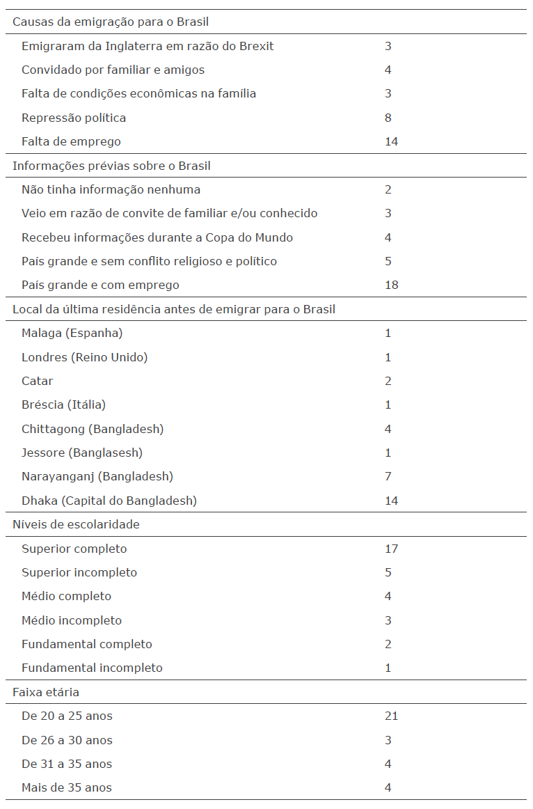 Os imigrantes bengalis não possuem uma homogeneidade nas decisões de emigrar, na situação financeira, nos trajetos que os conduziram ao Brasil, nas inserções na sociedade de destino, nos processos laborais e sociabilidade e de intenções de permanência ou não (Tabela 2). Por isso, torna difícil uma apreensão que dê um tom genérico em todos os campos e/ou itens relacionados à nossa pesquisa. As causas podem estar nos horizontes econômicos (empobrecimento, excesso de população em espaços urbanos reduzidos, ausência de emprego e renda), na esfera política (golpes de Estado, repressão política em razão de tomada de posição partidária, principalmente nas eleições de 2013, etc.), na história e trajetória longa de emigração no país, bem como de muitas famílias dos que estão inseridos no território brasileiro.