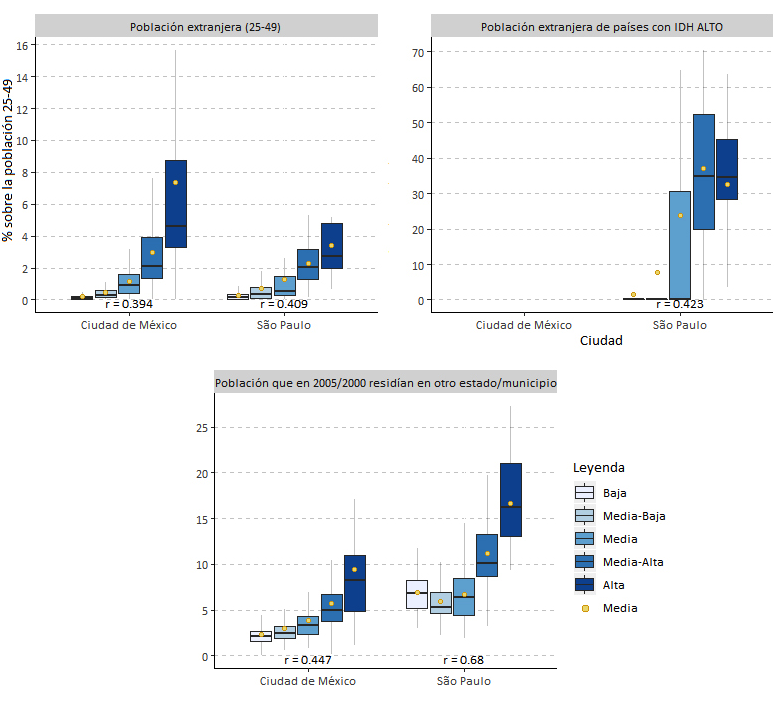 Fuente: Elaboración propia a partir de la base de datos extraída de Airbnb y censos de población de 2010.Las zonas en las que han penetrado los apartamentos turísticos mostraban en 2010 una proporción de población de nacionalidad extranjera mucho más elevada que los espacios en los que apenas existe oferta (Figura 7). Además, para el caso de São Paulo disponemos de la nacionalidad específica de la población, lo cual nos ha permitido comprobar que la presencia de Airbnb tiene una fuerte correlación con las zonas en las que la población originaria de países con un índice de desarrollo humano alto (por encima de 0,8) tiene mayor peso. Este patrón converge con lo identificado en el apartado anterior, en el que hemos observado un mayor nivel educativo de la población en las zonas en las que se concentra la actividad de Airbnb. También existe una fuerte correlación con la presencia de población que ha cambiado de municipio o estado en los últimos años.