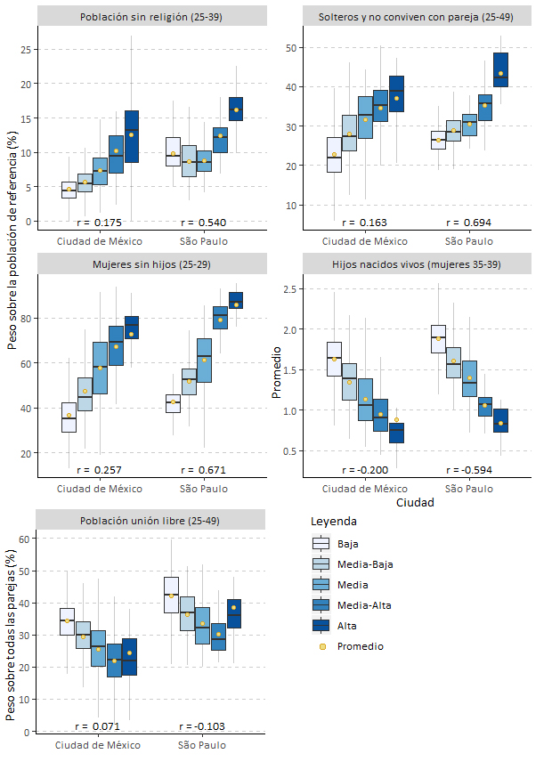Por lo que respecta a la fecundidad, la proporción de mujeres sin hijos a la edad de 25-29 años en los sectores en los que existe más oferta de Airbnb duplica a la que se registraba en los barrios de ambas ciudades con menor presencia de esta actividad. En Ciudad de México, casi el 80 % de las mujeres de 25-29 años que residía en 2010 en los sectores en los que ha penetrado Airbnb no tenían hijos; en São Paulo, casi el 90 %. La mayor proporción de población soltera (o no unida) y el retraso en la fecundidad se traducen en un claro menor número de hijos en las zonas con elevada presencia de Airbnb. Finalmente, la secularización es evidente en las zonas con mayor implantación de los apartamentos turísticos y la proporción de población adulta-joven que se declara sin religión duplica en estas unidades de análisis a la de los sectores en que no hay oferta.