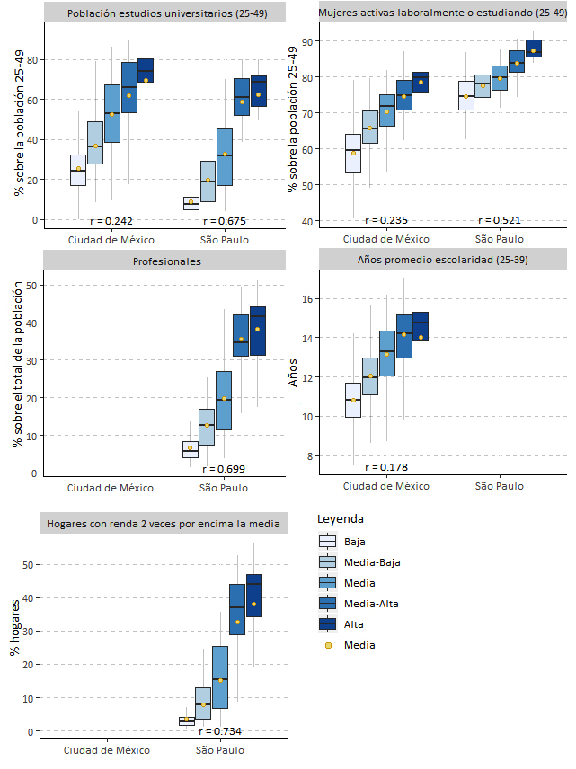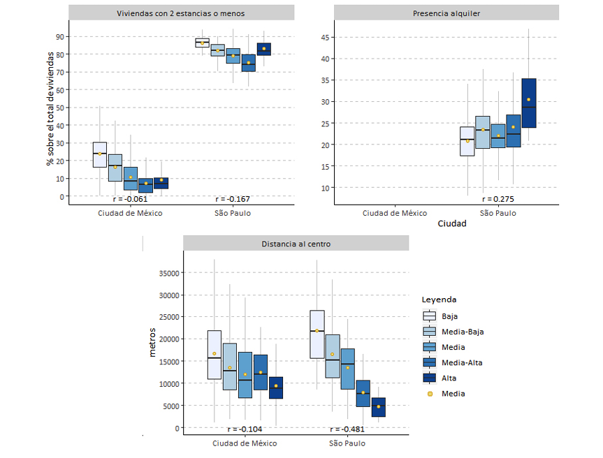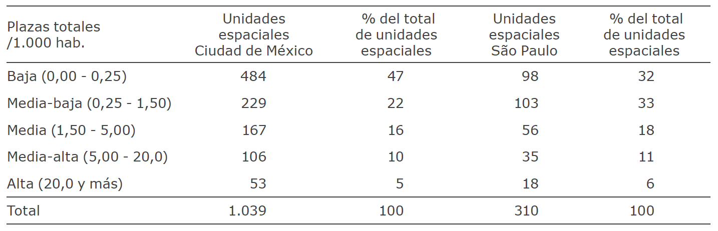 Por otro lado, hemos creado cinco categorías en función de la presencia relativa de las plazas totales en alojamientos turísticos (apartamentos + habitaciones privadas). Las categorías se han definido con el propósito de utilizar la misma escala en las dos ciudades y poder hacer un análisis preciso de las unidades en las que hay mayor actividad de Airbnb (Cuadro 3). Además, hemos calculado el coeficiente de correlación de Pearson de cada variable con el indicador relativo de presencia de Airbnb. Antes de revisar los resultados, cabe subrayar que el mayor número de unidades en que se divide Ciudad de México la hace proclive a mostrar correlaciones más bajas que las de São Paulo.
