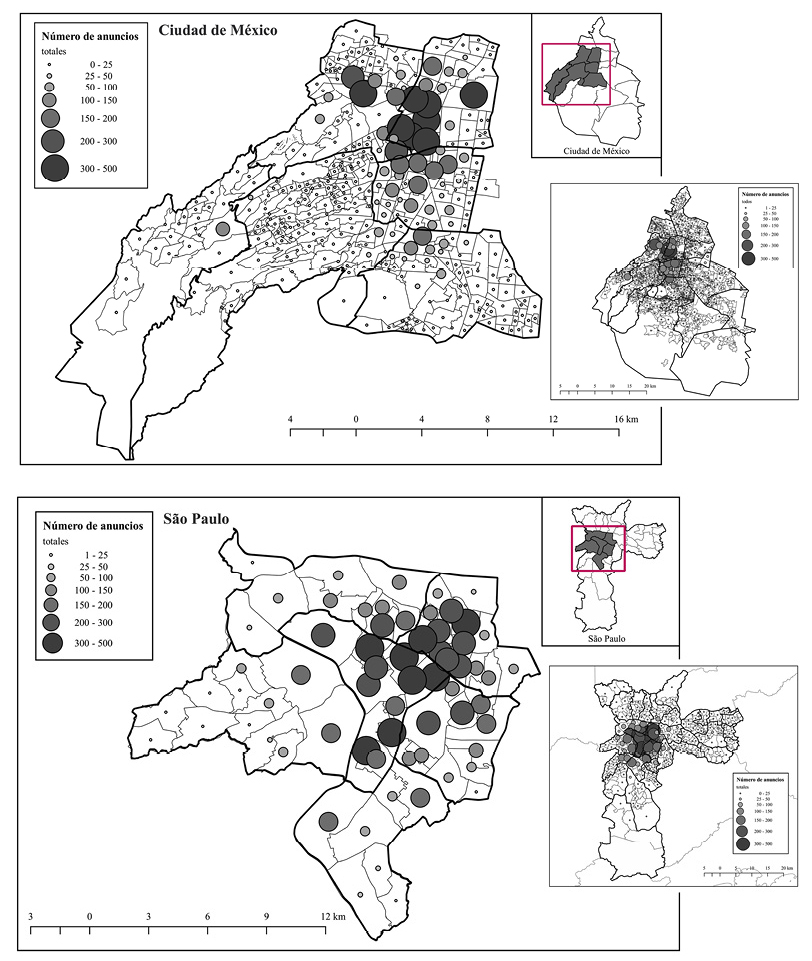 Así pues, disponemos de información con un elevado nivel de detalle geográfico en los dos municipios de estudio. Sin embargo, las AGEB son demarcaciones significativamente más pequeñas que las áreas de ponderación brasileñas, y su utilización haría difícil el ejercicio comparativo que nos planteamos en este trabajo. Para resolver esta limitación, hemos realizado una agrupación de las AGEB en función de los barrios o colonias de la Ciudad de México.4 Así, las unidades de análisis serán más equiparables, manteniendo siempre representatividad estadística. Como resultado de este ejercicio, finalmente trabajaremos con un total de 310 unidades espaciales en el caso de la ciudad brasileña, y 1.039 en la urbe de México. En São Paulo, cada unidad tiene una superficie media de 4,9 km2 y residen 36.300 personas (para un total de 11,3 millones de personas en el municipio), mientras que en Ciudad de México la superficie media de cada unidad es de 1,4 km2 y residen 8.480 personas (para un total de 8,8 millones de personas).