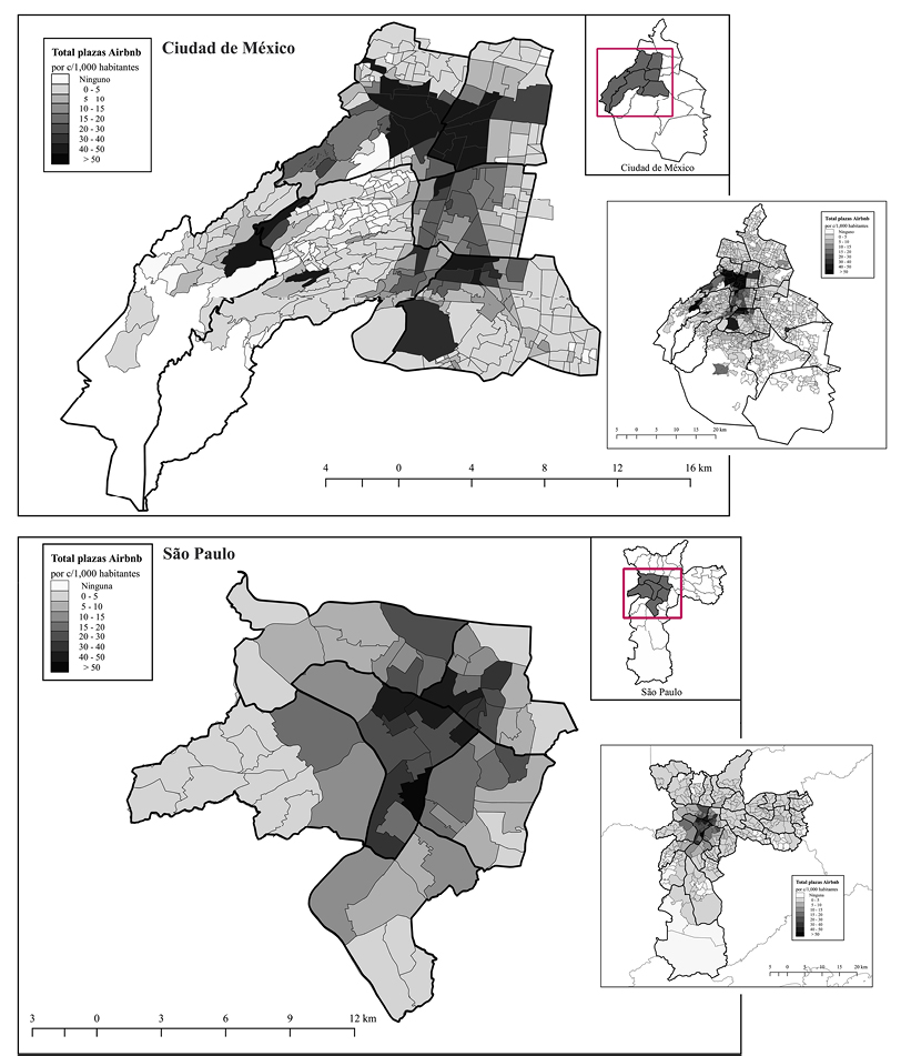 Los esfuerzos académicos e institucionales por ahondar en estos procesos han tenido lugar sobre todo en Europa Occidental y Norteamérica, mientras que en el contexto latinoamericano apenas existen estudios sobre la cuestión. En el presente trabajo pretendemos avanzar en el conocimiento de la irrupción de los apartamentos turísticos ofertados en Airbnb (la mayor plataforma electrónica que pone en contacto anfitriones y huéspedes en todo el mundo) en el contexto de América Latina con el estudio de las dos urbes más pobladas: Ciudad de México y São Paulo.