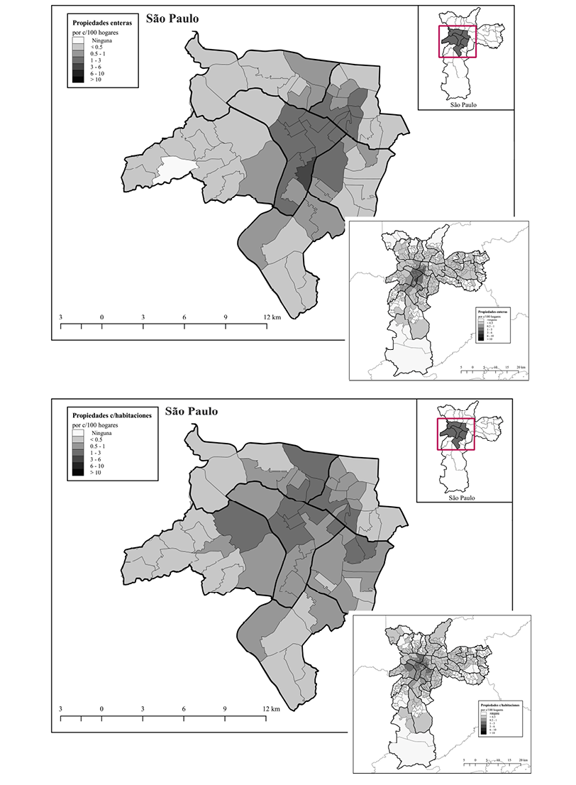 Los resultados obtenidos proporcionan evidencia empírica sobre la similitud de las dinámicas que se están experimentado en Ciudad de México y São Paulo con las de otras ciudades europeas y norteamericanas, aunque con sus singularidades propias. Entre estas especificidades, destacamos el fuerte contraste entre las zonas con mayor y menor presencia de esta actividad y la nula presencia de apartamentos turísticos en amplias zonas de la ciudad, probablemente asociada a la fuerte segregación socioeconómica de ambas ciudades. Ni en los sectores más exclusivos de las zonas suburbanas ni en las áreas en las que reside la población más vulnerable aparece apenas oferta de apartamentos turísticos. La penetración de los apartamentos de alquiler por días en áreas con menor atractivo turístico, pero sí con una fuerte actividad empresarial y financiera, también es un rasgo espacial que destaca, sobre todo en el caso de São Paulo.
