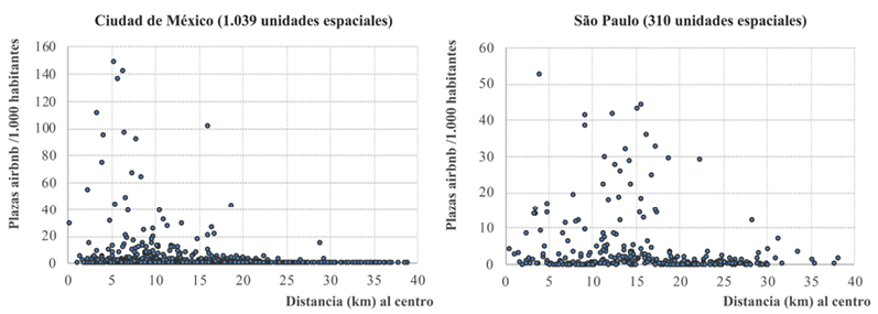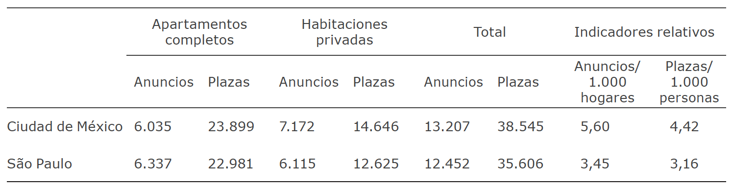 Fuente: Elaboración propia a partir de la base de datos extraída de Airbnb y censos de población de 2010. *En la Ciudad de México el número de estancias incluye todo tipo de espacios independientes (menos cocina y baño), mientras que en São Paulo solo incluye dormitorios.