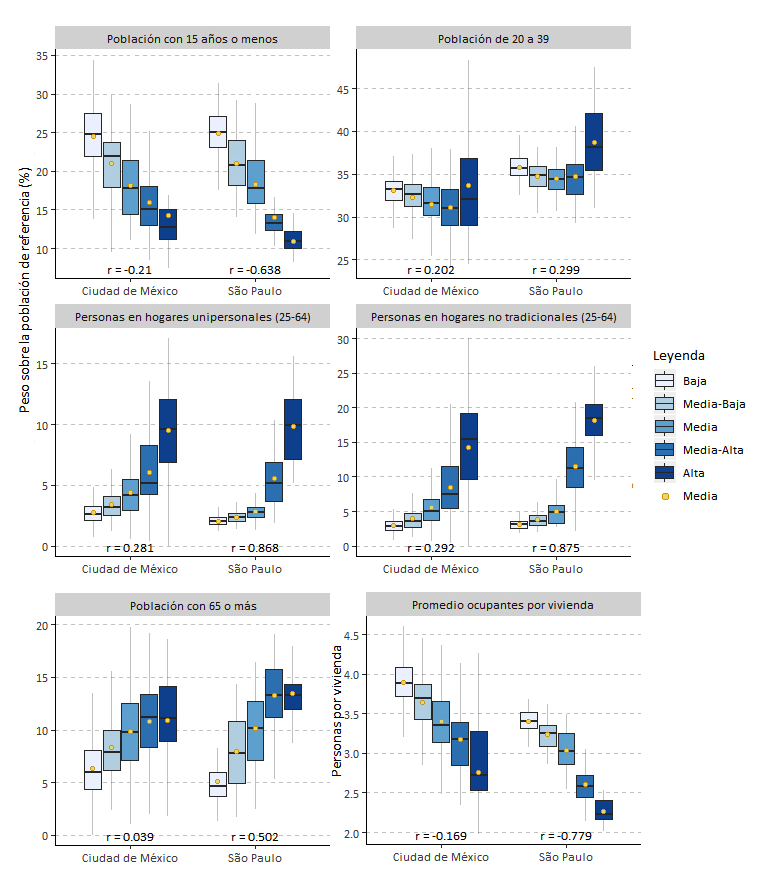 Fuente: Elaboración propia a partir de la base de datos extraída de Airbnb y censos de población de 2010.Así, mientras que en las unidades espaciales en las que apenas existe oferta de apartamentos turísticos la proporción de población infantil rondaba el 25 %, el mismo indicador se situaba por debajo del 15 % en las zonas con más actividad de las dos ciudades. El descenso es gradual en cada categoría a medida que aumenta la presencia relativa de Airbnb. Con respecto a la población adulta-joven, se identifica una muy elevada presencia de este colectivo solo en las unidades en las que existe una oferta de Airbnb muy intensa, sobre todo en el caso de São Paulo, donde la proporción de este grupo de edad alcanzaba casi el 40 %. La presencia de adultos jóvenes también es elevada en las unidades con poca oferta de apartamentos turísticos, pero la tipología de los hogares en estas edades nos da pistas sobre los motivos. En las zonas en las que no ha penetrado Airbnb, apenas había adultos viviendo en hogares unipersonales o en hogares no familiares. En cambio, en las zonas con mayor presencia de esta actividad, al menos uno de cada cuatro adultos vivía en hogares unipersonales o no familiares. En el caso de São Paulo, estas tipologías de hogar en edades adultas presentan una correlación de Pearson cercana al 0,9 con el indicador relativo de intensidad de Airbnb. De hecho, en São Paulo estos son los indicadores que obtienen los coeficientes de correlación más elevados de entre todos los calculados.