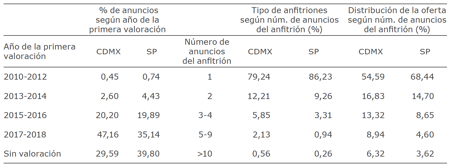 Fuente: Elaboración propia a partir de la base de datos extraída de Airbnb y censos de población de 2010. *En la Ciudad de México el número de estancias incluye todo tipo de espacios independientes (menos cocina y baño), mientras que en São Paulo solo incluye dormitorios.En los últimos años, han proliferado los trabajos que se han acercado al estudio de la penetración y expansión de los apartamentos turísticos en las ciudades de todo el mundo, así como en las consecuencias de esta actividad. Cada vez son más los científicos sociales que consideran que para entender la configuración socioespacial de las urbes del siglo XXI es necesario incorporar también este fenómeno (Slee, 2016; Wachsmuth y Weisler, 2018). Con este trabajo hemos abordado un tema que ha sido poco cubierto en el caso del contexto latinoamericano y hemos explorado el fenómeno en las dos ciudades más pobladas de la región, Ciudad de México y São Paulo, a través de dos líneas principales: la distribución espacial de la oferta de apartamentos en la plataforma Airbnb y la relación con la composición socioeconómica de la población de las zonas donde se ha asentado dicha actividad.