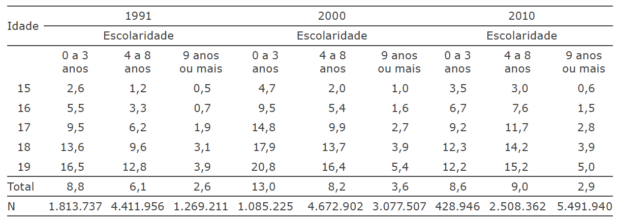 Fonte: Censos demográficos de 1991, 2000 e 2010O percentual de adolescentes que teve filho nascido vivo no ano anterior ao censo aumentou de 6,0 % para 6,3 % entre 1991 e 2000, e em seguida diminui para 4,6 % em 2010 (resultados não mostrados). A Tabela 3 apresenta a distribuição percentual destas adolescentes segundo idade e nível de escolaridade nos três censos demográficos. Os resultados confirmam um achado comum na literatura: quanto maior a idade, maior o percentual de adolescentes que teve filho no ano anterior ao Censo. Este resultado é observado em qualquer um dos grupos educacionais analisados. Em relação à escolaridade, o resultado se confirma, uma vez que, em cada idade analisada, quanto maior a escolaridade, menor a proporção de adolescentes que tiveram filho doze meses antes do censo.