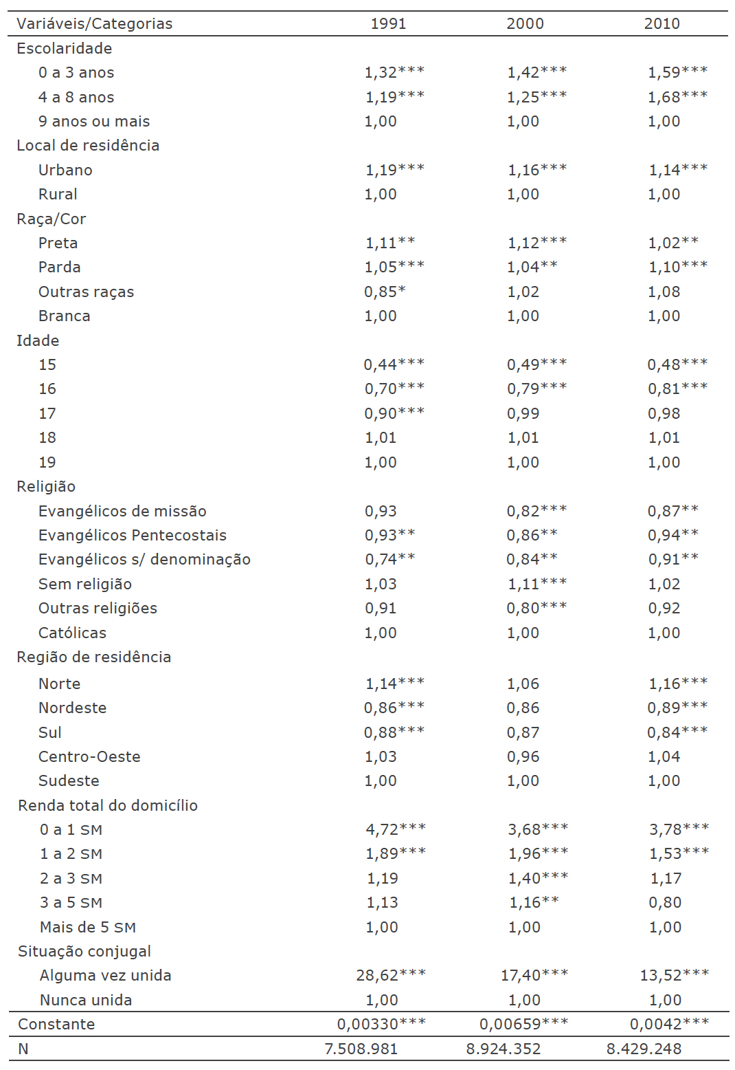 Ao comparar os resultados dos modelos de 1991 e 2000, é importante destacar o aumento dos diferenciais na chance de ser mãe adolescente segundo escolaridade. A razão de chance do grupo de 4 a 8 anos de estudo, por exemplo, aumentou de 1,19 para 1,25, enquanto a chance do grupo de 0 a 3 anos de escolaridade aumentou de 1,32 para 1,42, no mesmo período, em relação ao grupo mais escolarizado.