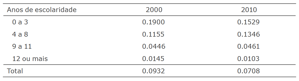 Em 2000, as adolescentes com 4 a 8 anos de estudo representavam 52 % do total das adolescentes e em 2010, 30 % (resultado mostrado na Tabela 1). É uma diminuição expressiva, mas o percentual de adolescentes entre 4 e 8 anos de escolaridade ainda é muito alto (lembrando que elas têm, pelo menos, quinze anos de idade). Em 2010, as adolescentes com este nível educacional apresentaram uma dificuldade muito maior de inibir a fecundidade (em relação àquelas com nove anos ou mais) do que àquelas com o mesmo nível de escolaridade em 2000.