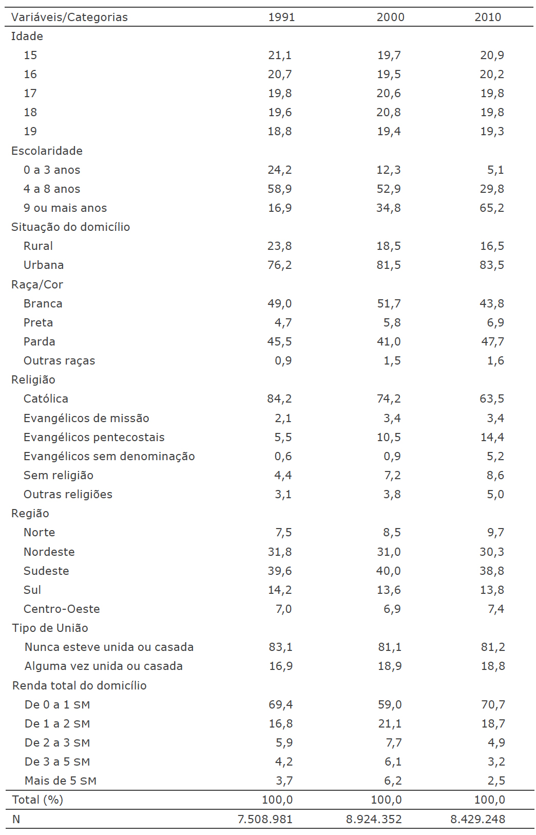 Esse estudo buscou comparar os diferenciais das taxas de fecundidade das adolescentes segundo grupos de escolaridade entre 1991 e 2010. A Tabela 2 apresenta, para os três censos demográficos, a distribuição percentual das adolescentes segundo as variáveis utilizadas neste trabalho. Algumas mudanças chamam atenção como, por exemplo, o aumento do percentual de adolescentes com maior escolaridade (nove anos ou mais de estudo), o aumento de adolescentes filiadas às igrejas evangélicas, e a diminuição de mulheres que se auto reportaram de cor/raça branca.