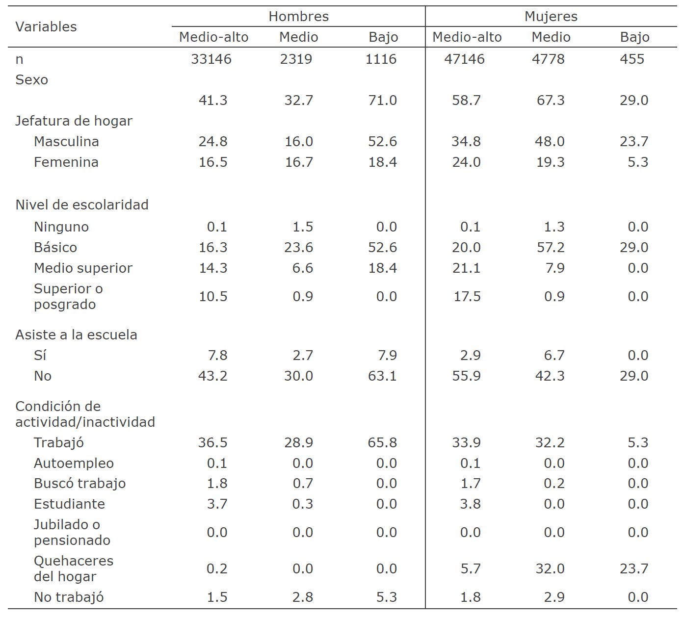 En esta dimensión se consideró a la escolaridad promedio por hogar. De acuerdo con Echarri (2008, p. 77), la escolaridad promedio incide en la estructura social del hogar en dos vías: la primera como inversión, y la segunda como ascenso en el desarrollo económico, ambos aspectos que determinan el nivel de bienestar del hogar en su conjunto. Por ello se usó como variable proxy del estrato social. Se calculó una variable del promedio de escolaridad en el hogar, y posteriormente se hizo dicotómica para dividir en escolaridad baja cuando los años de escolaridad no superan el nivel básico y escolaridad alta cuando superan dicho nivel.