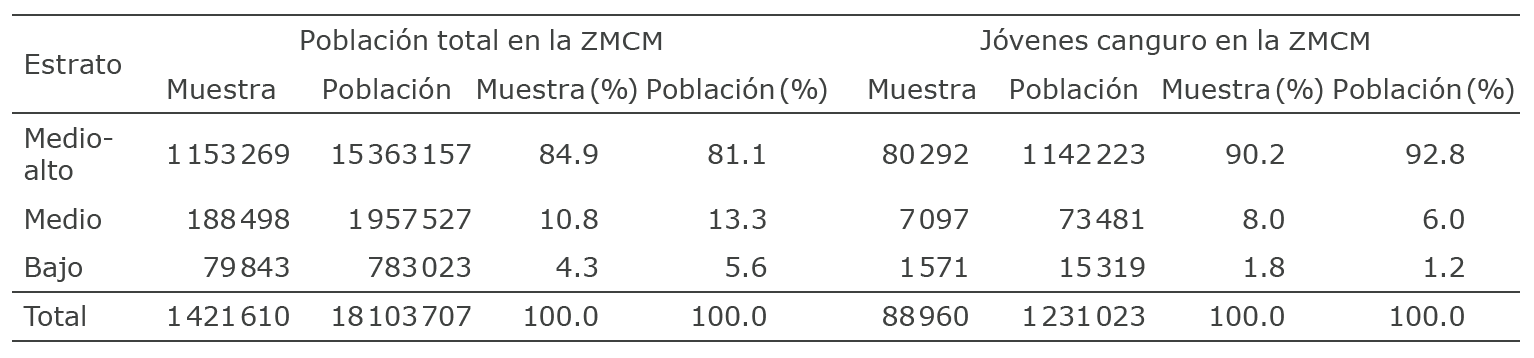 El tamaño de muestra obtenida de la ZMCM corresponde a 442 840 viviendas que equivalen a 4.5 millones, con 1 645 437 individuos encuestados que representan a 20 892 724 residentes. Al clasificar a los individuos según tres estratos, la muestra resultó de 1 421 610 personas que corresponden al 86.7 % del total de los residentes. La muestra de los jóvenes canguro asciende a 73 285 individuos, mismos que personifican a 1 017 622 y que representan 30.5 % de la población de 25 a 34 años que habitan en la ZMCM.