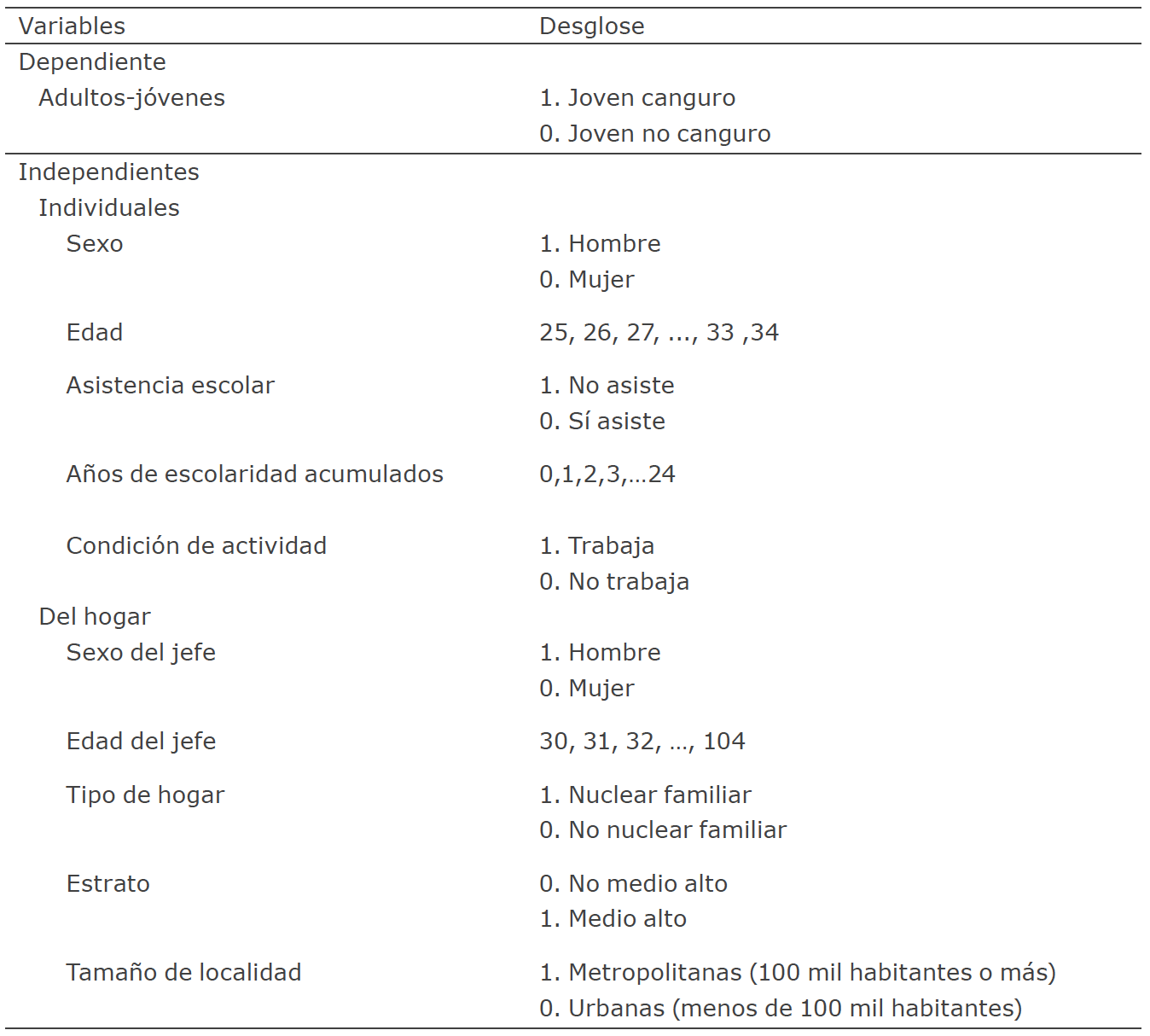 Este documento tiene como objetivo identificar a los jóvenes que no se emancipan y revisar cuáles son sus características y los factores que inciden en su condición. Nuestra población de estudio es aquella que tiene entre 25 y 34 años,1 y que prolonga su emancipación del hogar familiar (asumiéndose como hijos/as de familia). En términos espaciales, el análisis se ubica en la Zona Metropolitana de la Ciudad de México (ZMCM), un contexto altamente urbano, en tanto la literatura ha señalado que es ahí donde ocurre principalmente este fenómeno. La base de datos que se utiliza es la Encuesta Intercensal 2015 y el estudio se basa en un modelo logístico binario que permitirá analizar la incidencia de las variables (individuales y familiares) sobre la probabilidad de ser o no ser joven canguro.