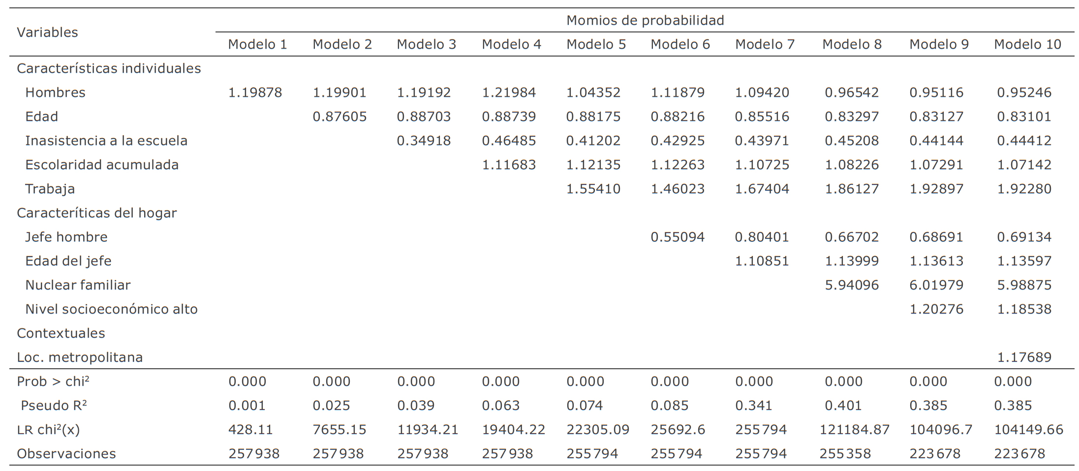 Como se dijo anteriormente, se estimaron diez modelos con la intención de conocer el efecto de distintas variables en la permanencia de los y las jóvenes canguro en el hogar. El modelo 1 muestra el efecto de la variable sexo, el modelo 2, el efecto de la variable sexo junto con el de la edad, hasta llegar al modelo 10, que muestra el efecto de las diez variables consideradas (Cuadro 2).