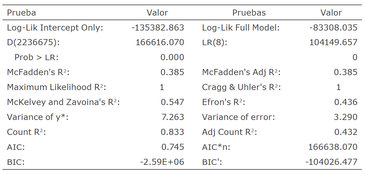 Fuente: Elaboración propia con base en la Encuesta Intercensal 2015Como se puede observar el modelo de regresión logística binaria número diez es el más completo. De este último se obtuvo la bondad de ajuste que se muestra en el Cuadro 4. Las diferentes pruebas hacen de él un modelo pertinente y con un buen ajuste a los datos.