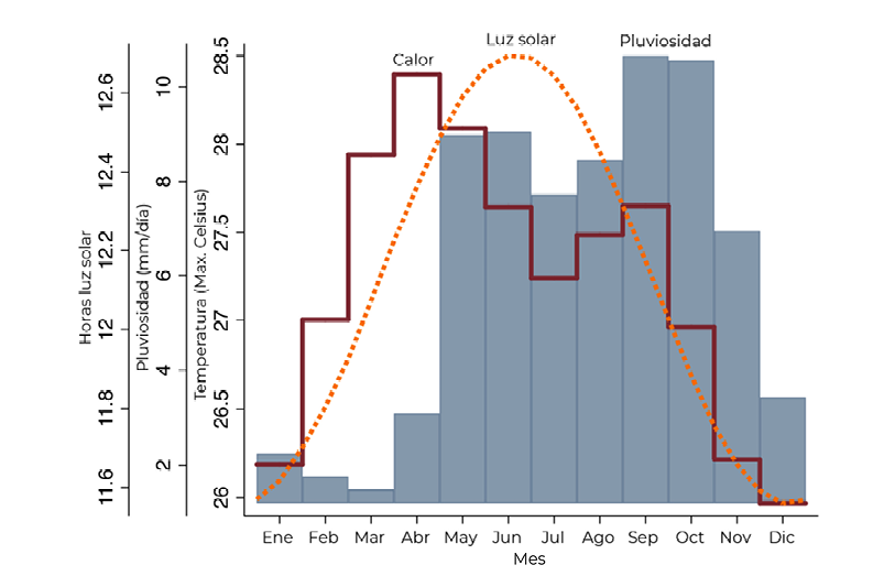 Fuente: Los datos de precipitación fluvial y temperatura son promedios demoponderados de datos publicados por el Instituto Meteorológico Nacional de Costa Rica (IMN, 2012) para quince estaciones meteorológicas durante 1970-2010. Estimamos la cantidad diaria de luz solar con base en la información del sitio web Time and Date (2018).