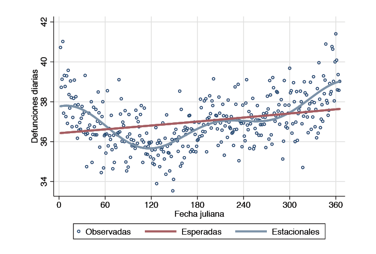 Nota: Cada punto es el número medio de defunciones en ese día del año durante 1970-2016. Esperadas = promedio esperado por variación secular.