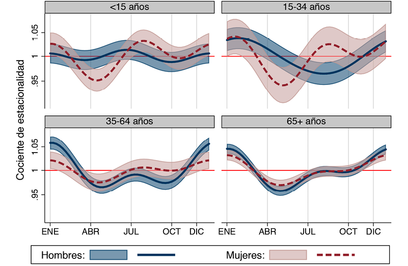 Fuente: Elaboración propia a partir de las bases de microdatos de defunciones disponibles en la web del Centro Centroamericano de Población (CCP, 2018).La Gráfica 3 muestra el coeficiente de estacionalidad estimado por sexo y cuatro grandes grupos de edades. Muestra también el intervalo de confianza (IC) al 95 % de este cociente como áreas sombreadas alrededor de la línea de regresión. Si el IC no toca la línea de la unidad, es indicación de que la estacionalidad es estadísticamente significativa. Asimismo, si las áreas de IC por sexo no se sobreponen entre sí, se tendría una diferencia significativa por sexo en la estacionalidad.