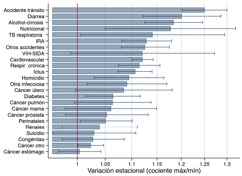 Con el propósito de reducir la información analizada para los veintiséis grupos de causas de muerte, la Gráfica 4 resume la estacionalidad con la amplitud entre el máximo y mínimo, medida como cociente. Las causas de muerte están ordenadas de mayor a menor amplitud estacional, aunque en algunos casos el intervalo de confianza es tan amplio (p. ej. TB respiratoria) que la estimación puntual es irrelevante. Descartando las estimaciones poco confiables con grandes IC, se observa que las muertes por accidentes de carretera son las que tienen mayor variación estacional, seguidas por las producidas por diarreas, alcoholismo e infecciones respiratorias agudas (IRA). En el ápex de mortalidad en carreteras, esta es 25 % mayor que en el punto mínimo.